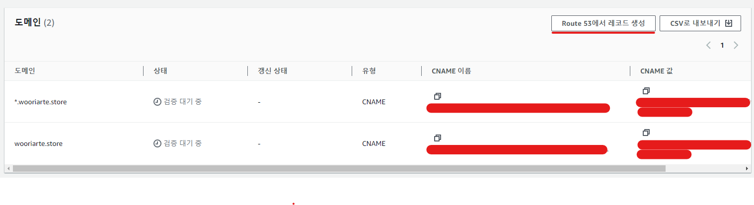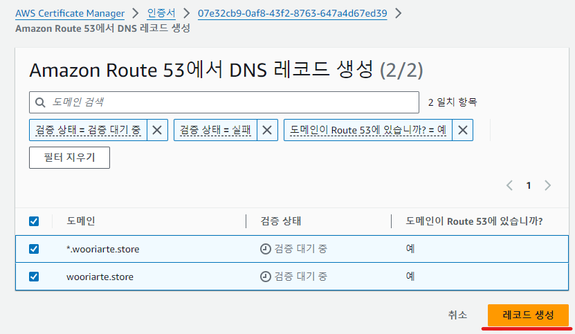 이후 생성한 ACM에 들아가서 도메인과 서버를 연결하기 위해 Route 53에서 레코드 생성을 클릭한다.